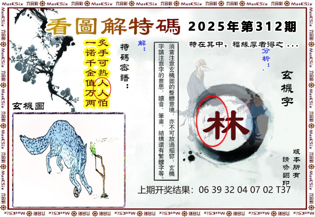 | 311期:内幕①肖+三中三开:蛇37准 内幕①肖:【蛇】 三中三:【02-32-39】 |